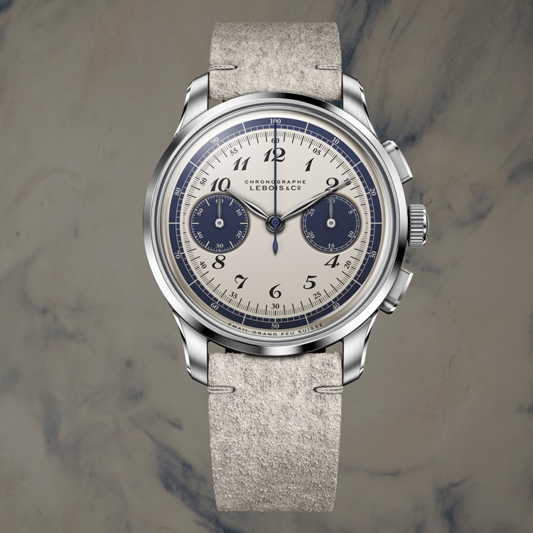 Lebois & Co introduces the Heritage Atelier Chronograph ‘Bleu sur Blanc’ (Ref. 324.552), a refined enamel-dial timepiece within its Atelier sub-collection. The watch features a warm off-white Grand Feu enamel dial paired with deep blue chronograph registers, highlighting a classic two-register layout with artisanal execution. The Atelier line focuses on small-batch creations that emphasize dial craftsmanship, texture, and finishing. The enamel dial is made using traditional Grand Feu techniques, where multiple layers are fired at high temperature to achieve a durable, glass-like surface with rich depth. Its subtly domed three-piece construction enhances light reflection, producing a distinctive tone between eggshell warmth and bright white clarity.