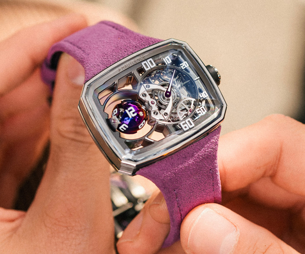 Hautlence returned with a new variation of its iconic Sphere Series 3, a mesmerizing mechanical sculpture now presented in a more compact and daring silhouette. The rectangular titanium case, featuring clean, sculptural lines and subtle reliefs, houses a fully reworked movement in a smaller format. Architectural and hypnotic, the watch embodies Hautlence’s vision of elevating mechanics to kinetic art, balancing visual power with intimacy. Water-resistant to 10 ATM, the Sphere Series 3 maintains its futuristic presence while embracing contemporary refinement, demonstrating the brand’s commitment to innovation, technical mastery, and sculptural watch design. |