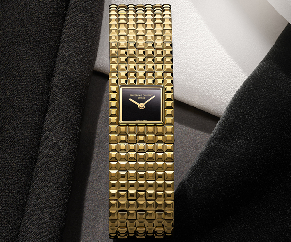Frederique Constant redefines contemporary watchmaking with the new Classics Manchette, reviving an icon through a daring glam-rock spirit. Completing the collection, an exclusive fifth model elevates the timepiece into a true style statement. The sculptural Clous de Paris bracelet alternates brushed and polished finishes, capturing light with architectural flair. An ultra-slim yellow-gold PVD case balances solar elegance and durability. At its heart lies a genuine black onyx dial, deep and mysterious, contrasted by yellow-gold hands and protected by anti-reflective sapphire. Unique and confident, this creation transitions effortlessly from daytime sophistication to evening glamour with timeless allure and bold modern character.