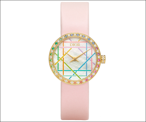 The La D de Dior watch, launched in 2003 and designed by Victoire de Castellane, has become an iconic jewelry timepiece. Known for its elegant curves and two pared-down hands, it celebrates feminine freedom and playful creativity with materials, colors, and proportions. This season, the collection reinvents itself with modern interpretations, featuring the graphic, hypnotic Cannage motif in gold or steel, often accented with diamonds. The iridescent mother-of-pearl dial animates the geometric pattern, while a rainbow version with changing reflections and a pink satin strap adorned with sapphires, amethysts, tsavorites, tourmalines, and emeralds showcases Dior’s virtuosity, elegance, and audacious style. |