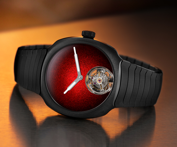 For the first time, H. Moser & Cie. embraces ceramics, a technically demanding material, to elevate the flowing elegance of its iconic Streamliner collection. The cushion-shaped case and integrated bracelet are crafted in anthracite grey ceramic with alternating polished and satin finishes. A Red Fumé Grand Feu enamel dial—devoid of indices or logo—highlights the clean architecture, while the flying tourbillon with double hairspring adds dynamic movement. With the Streamliner Tourbillon Concept Ceramic, the Schaffhausen-based Manufacture demonstrates its commitment to forward-thinking, masterful, and timeless watchmaking. |